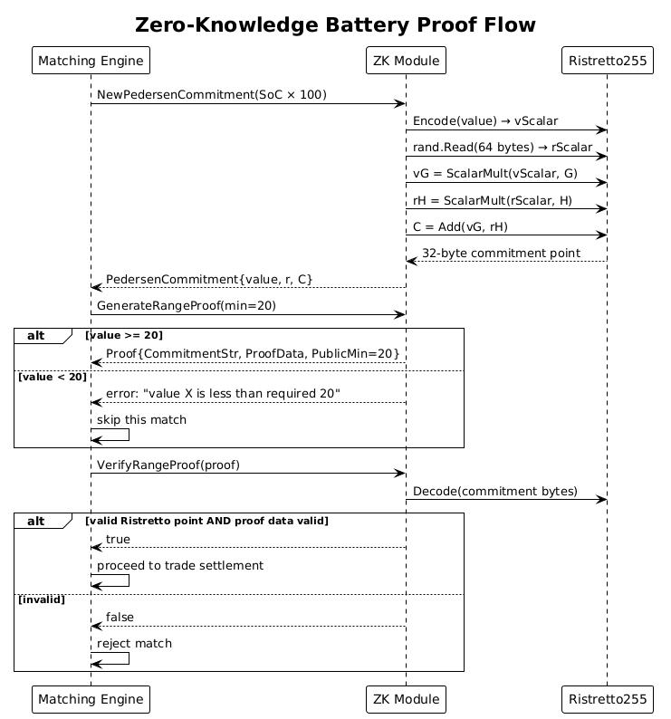 Sellers prove they have sufficient battery capacity to fulfill an order — without revealing the exact battery percentage. The matching engine verifies this claim before executing any trade.